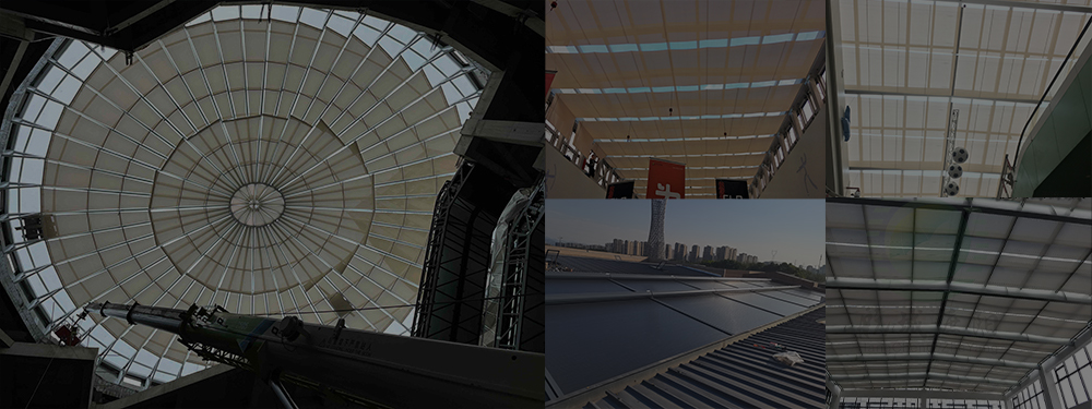 卷軸式方案,面料運(yùn)行方向與原有結(jié)構(gòu)貼合度高,最大程度保持原有屋面結(jié)構(gòu)美觀